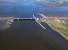 Das Eidersperrwerk befindet sich im Gemeindegebiet von Tönning in Nordfriesland, liegt aber direkt neben dem Badestrand der Stadt.